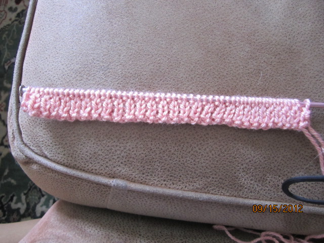 The ribbing makes it stretchy. This ribbing is a K1, P1 ribbing. The back and forth with the yarn string to go from purling to knitting is enough to make you batty. That is one reason for the half inch modification, mentioned earlier.
